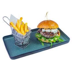 Grilled beef patties, lettuce, tomato and cheese, French fries
