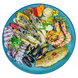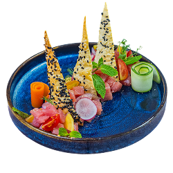 Grilled fish fillet, sesame, tapenade, cucumber, lettuce, tomato, radish, tzatziki