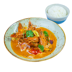 Deep-fried squid, tzatziki sauce, steamed organic rice